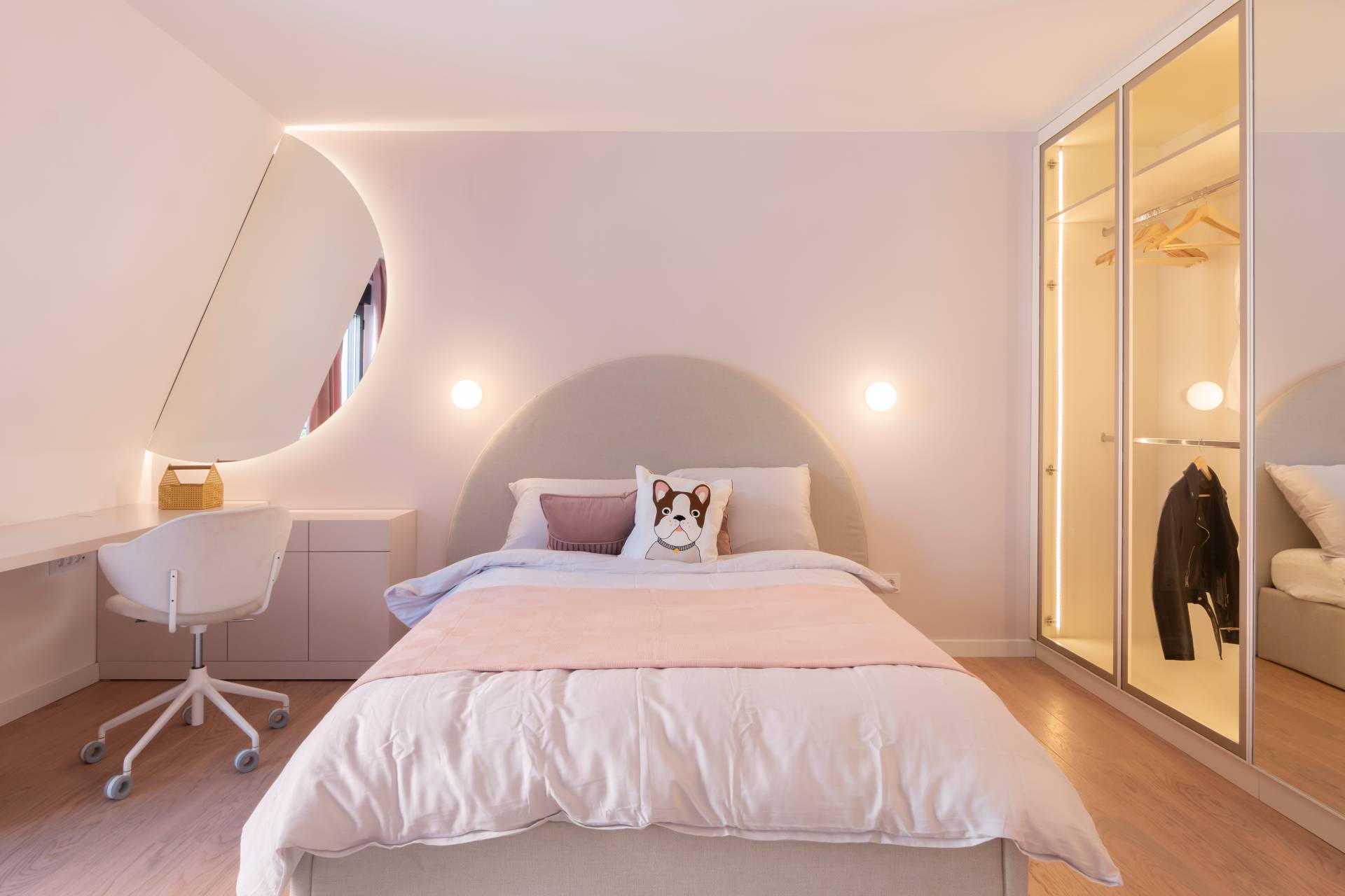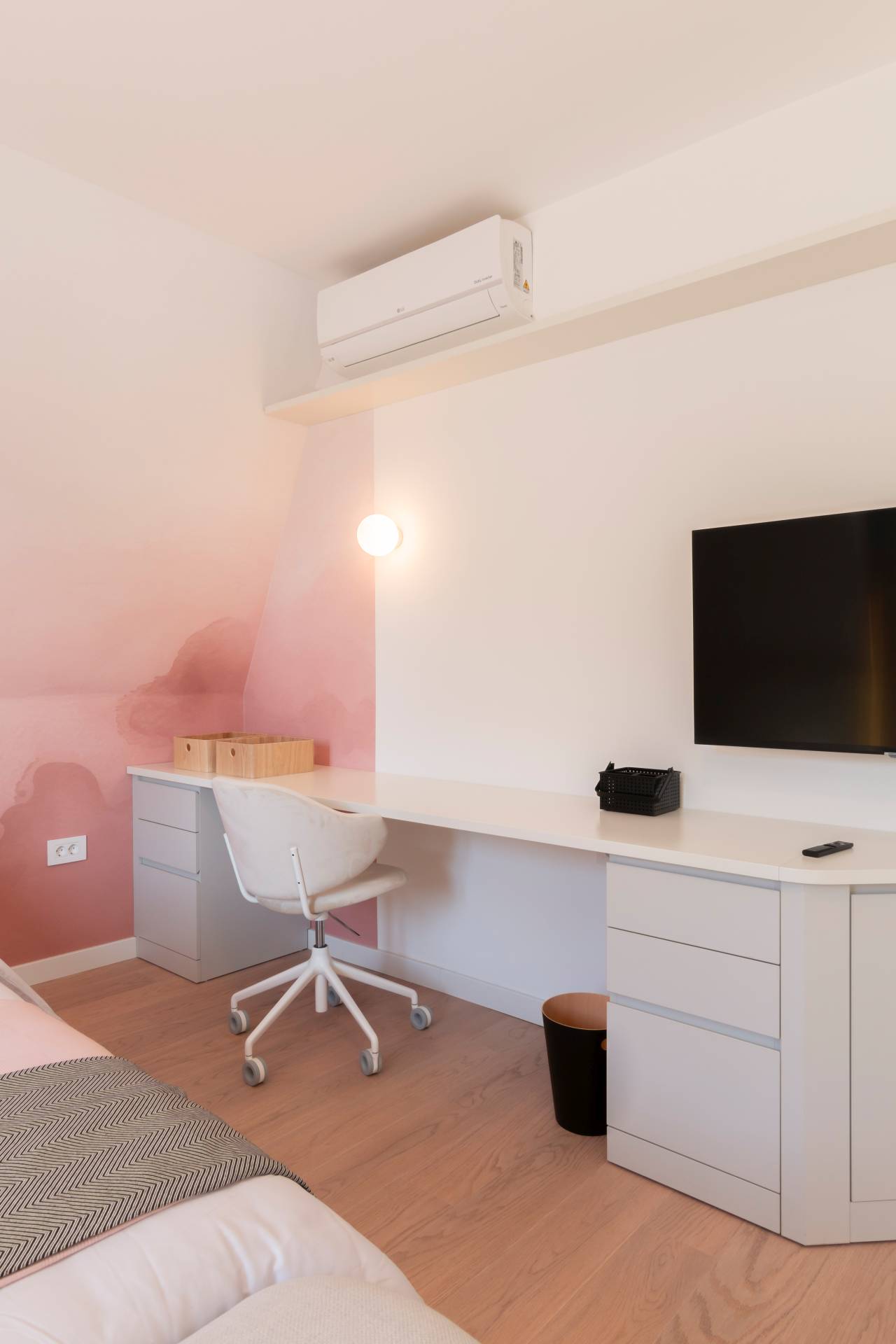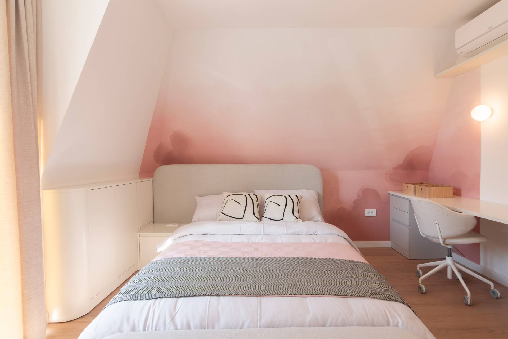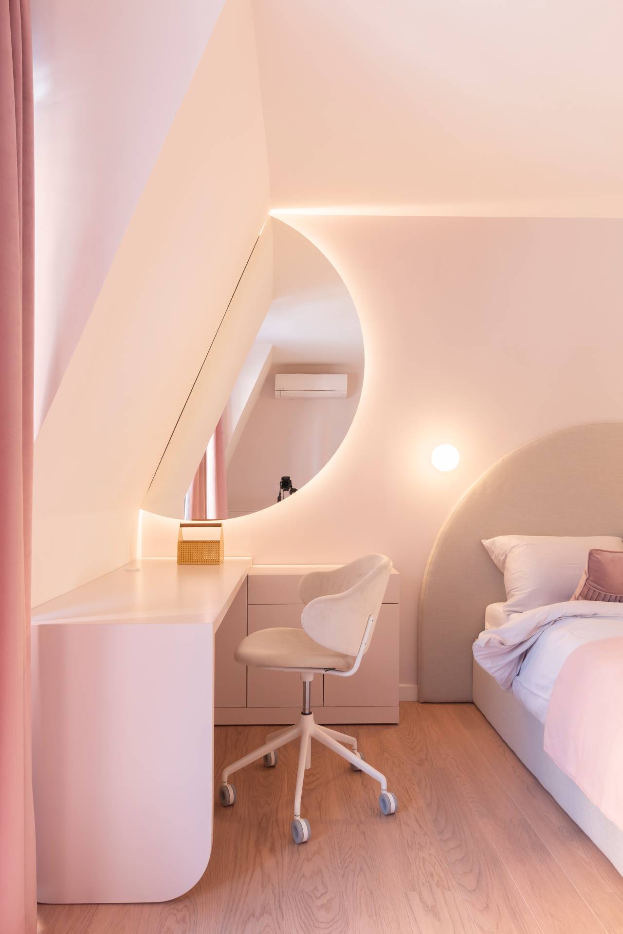 Na spratu su spavaće sobe u adaptiranom prostoru dobile posebnu pažnju. Sonja navodi: „Što se tiče dečijih soba, jedini uslov klijenata jeste bila sama boja prostorija.“