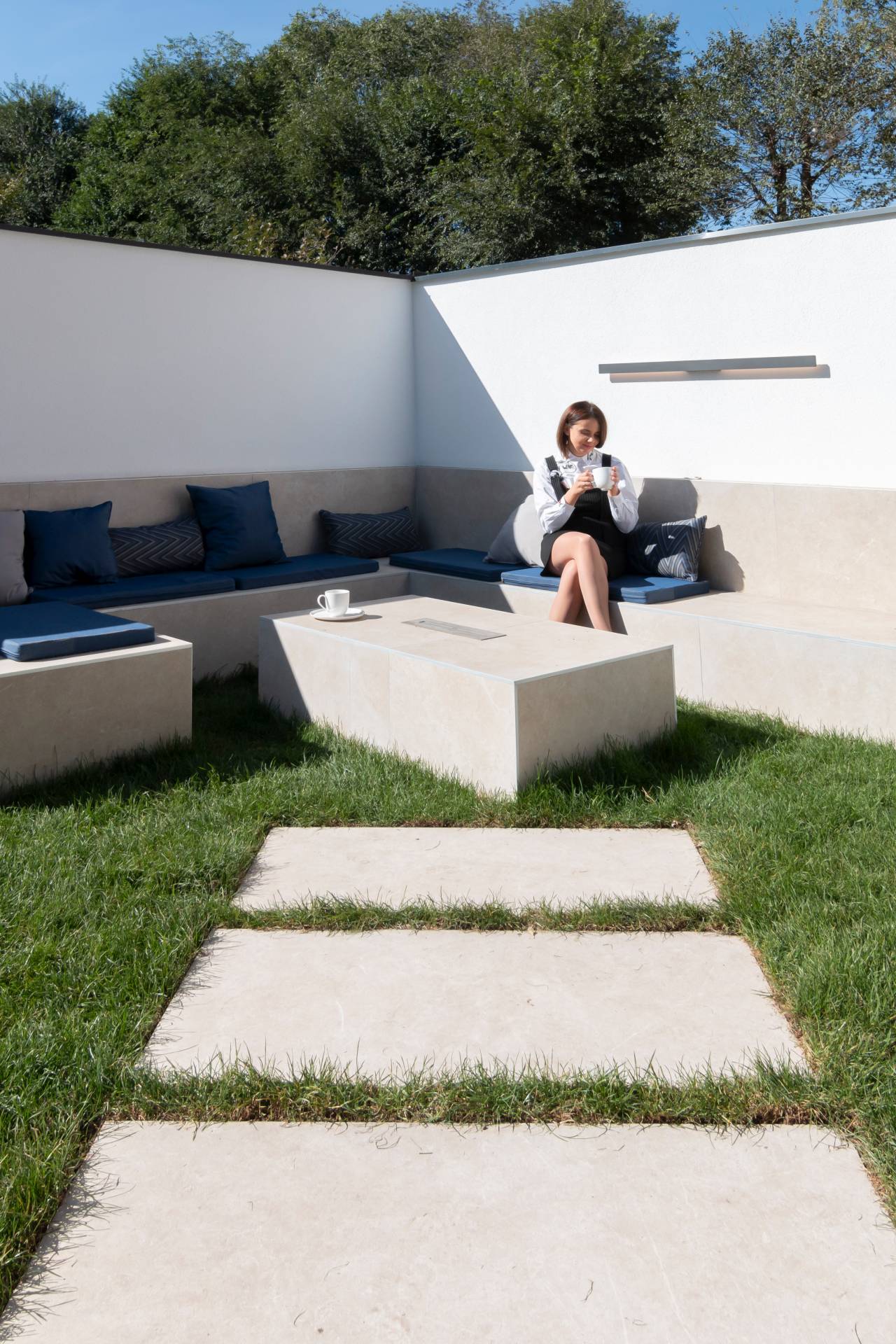 Omiljeni kutak za sedenje nalazi se u uglu dvorišta koji je napravljen od blokova i obložen je keramikom, preko kojih su postavljena udobna sedalna mesta za uživanje i tokom dana i tokom noći kada atmosferi doprinosi otvoreni kamin.