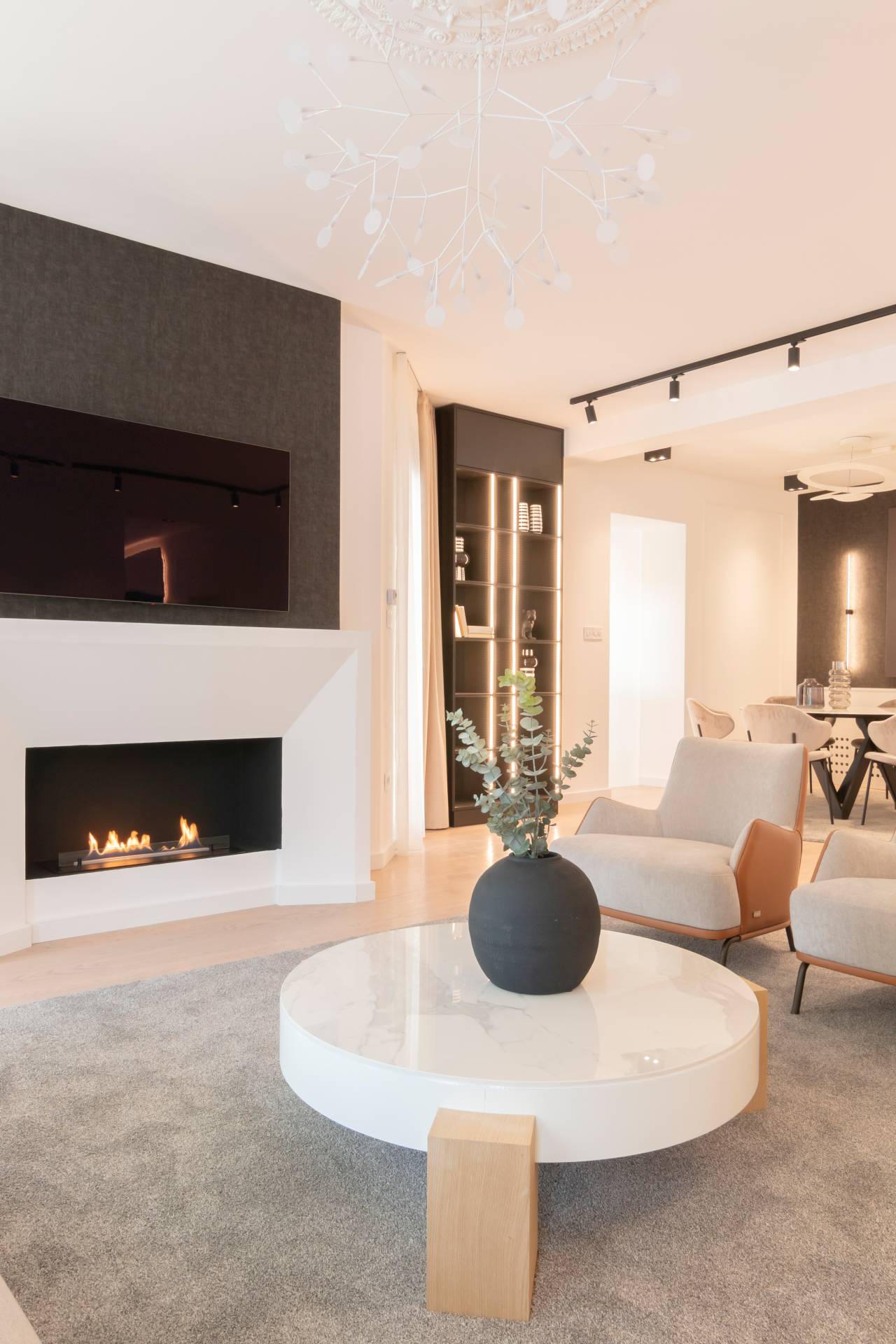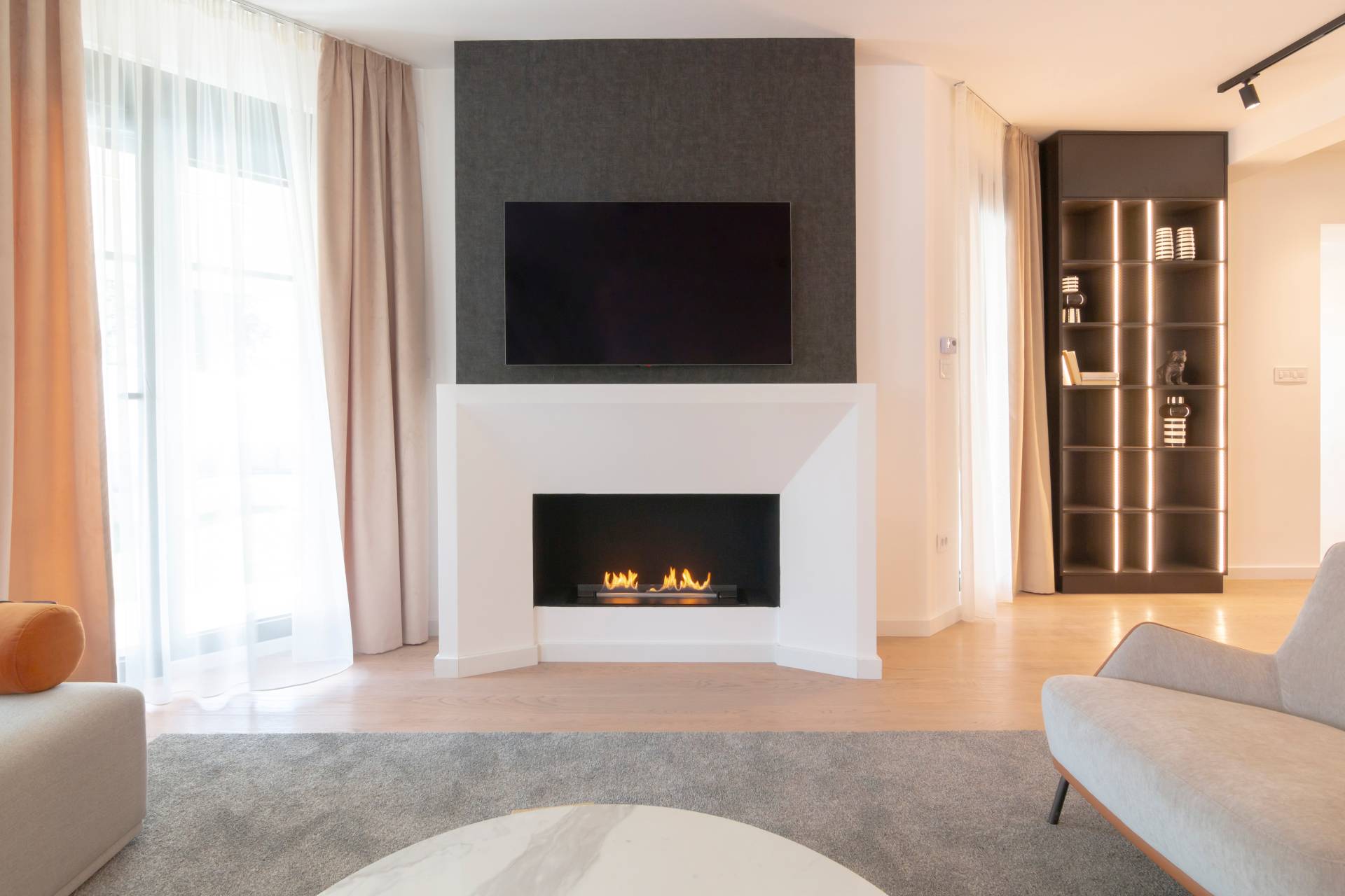 Dnevni boravak i trpezarija spajaju se u jedan veliki prostor akcentovan rasvetom, umetničkim slikama ali i kaminom kao fokus tačkom.