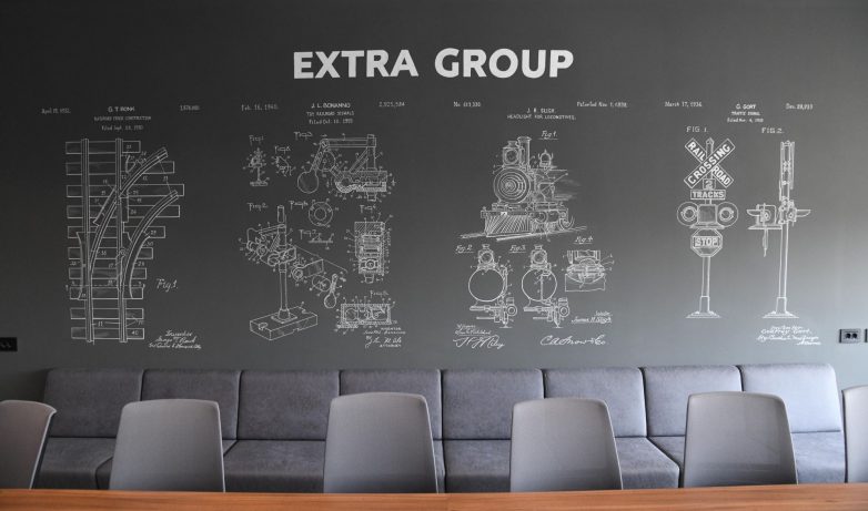 Posebno je dinamičan zid ručno oslikan skicama starih patenata za potrebe železnice.