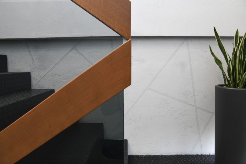 Zid ka radionici je obložen keramikom velikog formata i visoke refleksije, a beli zid ka open-space kancelariji je oslikan i simbolično predstavlja svako od preduzeća pod istim krovom.