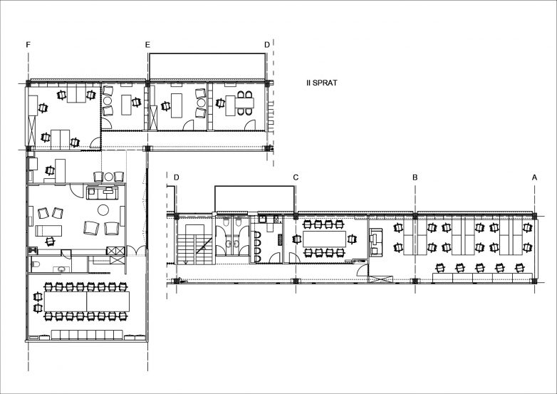 Kancelarije na uglu drugog sprata, vezi sa novim delom, dugim staklenim frontom proširuju prilaz kabinetu direktora. Prostor sa pultom sekretarice i hodnik koji iz njega vodi oko kabineta do konferencijske sale imaju pogled na radionicu.