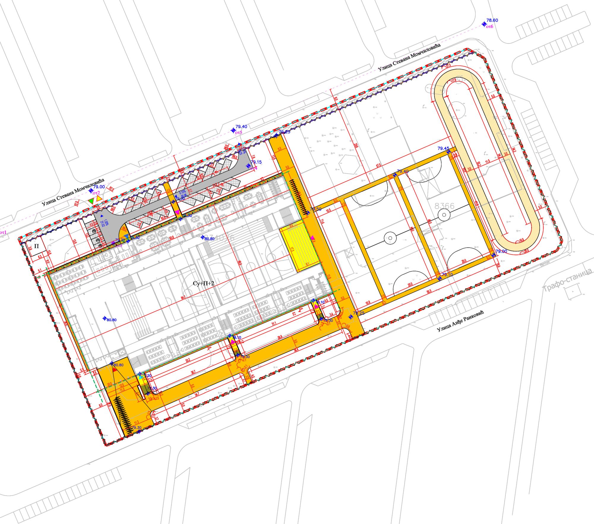 Trakt prema ulici Stevana Momčilovića je funkcionalno opredeljen za kuhinjski prostor, prateće prostorije, svlačionice, teretanu, sanitarni blok i prostor podstanice.