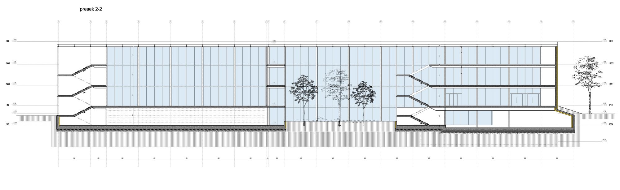 Radi maksimalnog iskorišćenja oblika i dubine parcele objekat je koncipiran kao dvotrakt, čime je formiran centralni atrijum sa slobodnim prostorom koji omogućava dvostranu orijentaciju na nadzemnim etažama.
