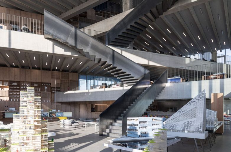 Stepenište se uspinje uz prostor, povezujući naglašene betonske nivoe. Otvorenim kancelarijskim prostorom dominiraju izloženi betonski elementi i drveni elementi za skladištenje.