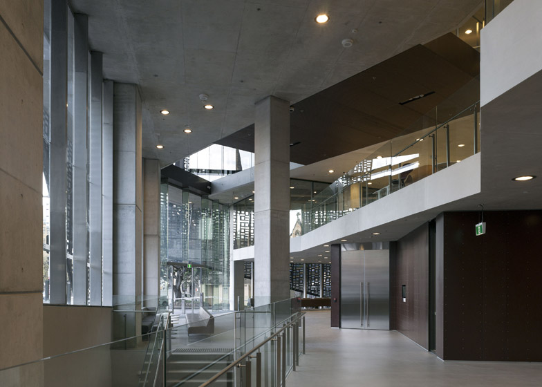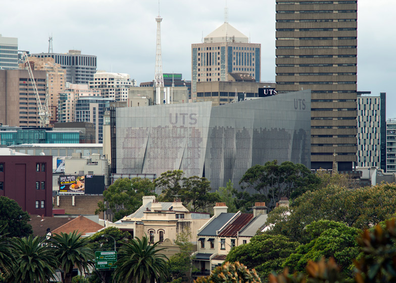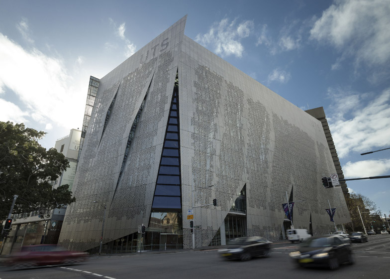 Aluminijumska obloga fasade izbušena je malim jedinicama i nulama ispisujući ime novog tehnološkog fakuteta u Sidneju u binarnom kodu.