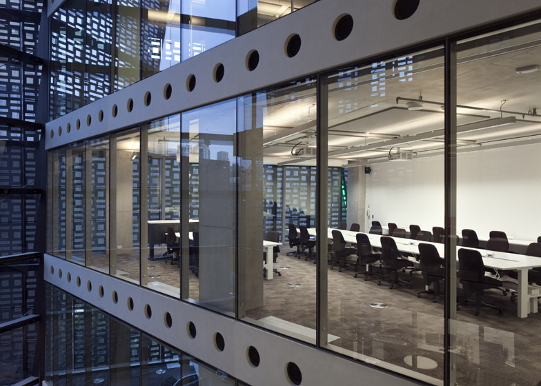 Tek kada se približite zgradi od 14 spratova videćete malene nule i jedinice na aluminijumskoj oblozi koja prekriva celu fasadu. Perforacija omogućava prodor svetlosti unutar objekta i pravi zanimljivu igru svetlosti u enterijeru.