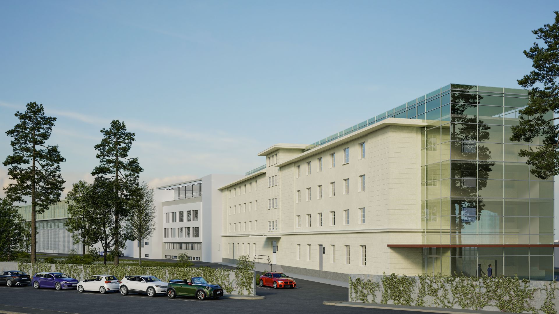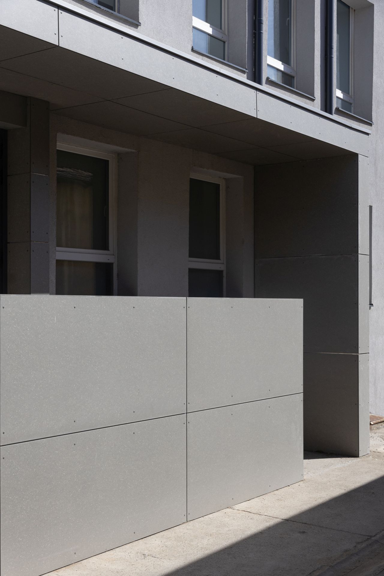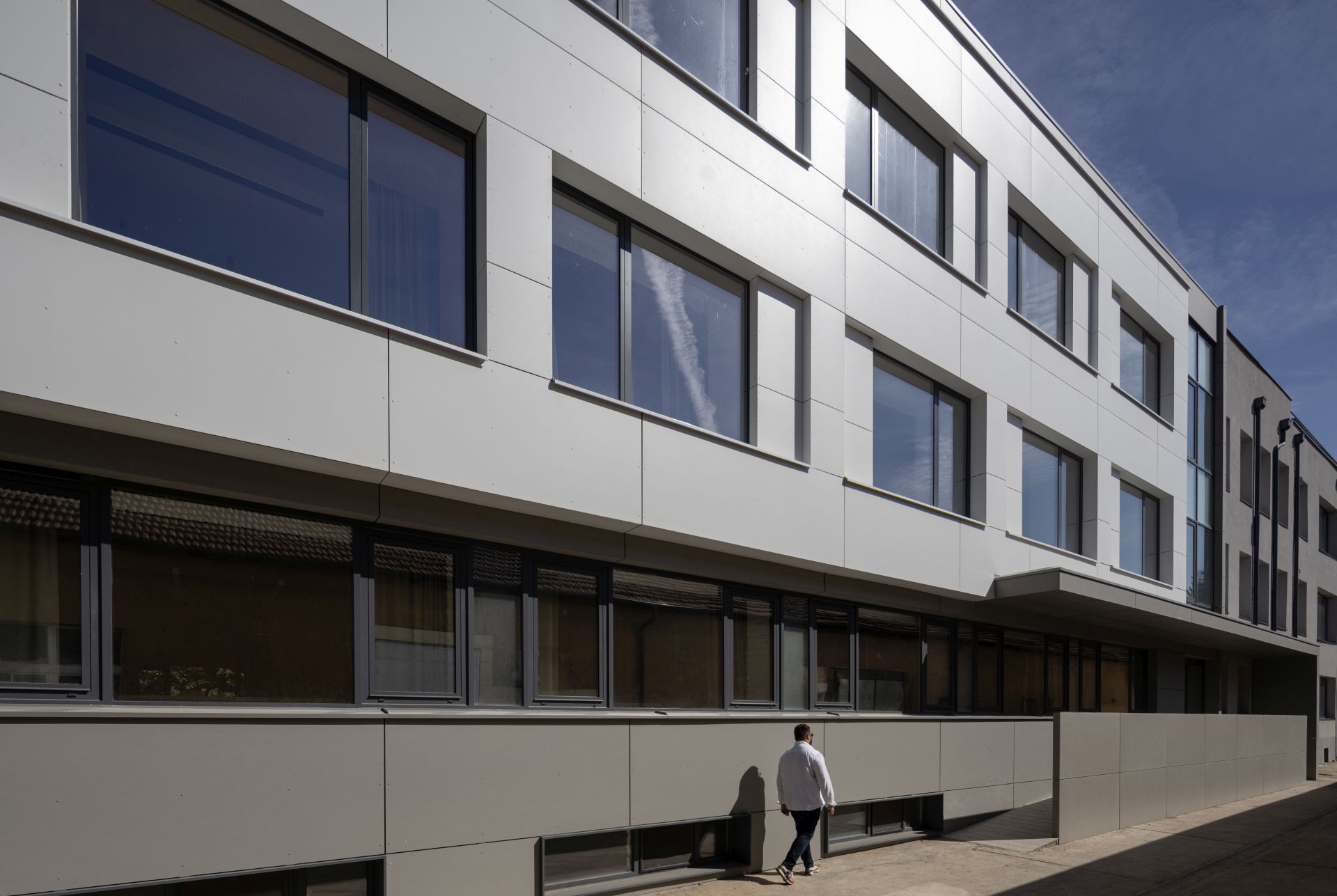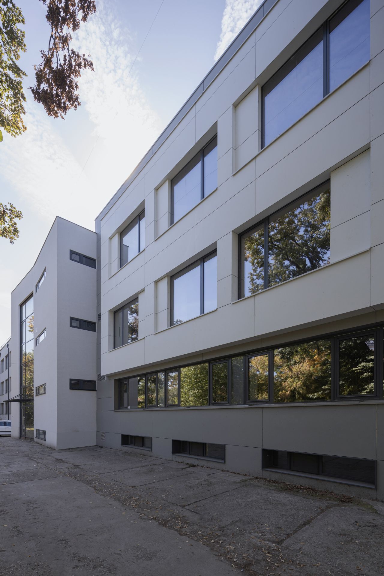 Fasadni sistem je projektovan kao ventilisana fasada, osim u zoni vertikalnih komunikacija, na spoju sa susednim objektom, gde je realizovana kontaktna fasada. Završna obloga ventilisane fasade izrađena je od fibrocementnih Swisspearl ploča, na aluminijumskoj potkonstrukciji, postavljenih na različitim distancama od osnovnog korpusa postojećeg objekta.