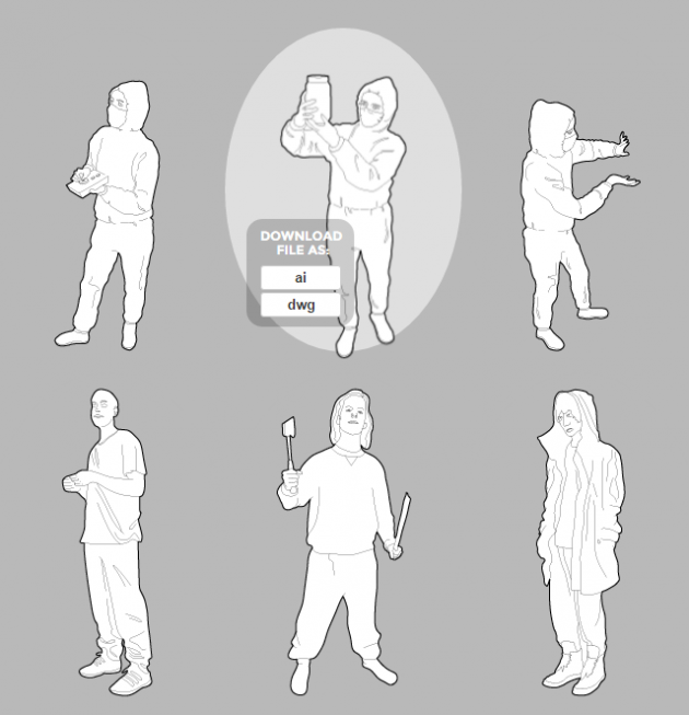 Modele je moguće koristiti u Illustratoru ili AutoCAD-u (.ai i .dwg format) a izbor je zaista šarolik. Na raspolaganju su vam osobe koje stoje, trče, sede pa sve do ljudi koji rade ili guraju kolica s bebom. Crteži su veoma detaljni a svaki je sastavljen od pozadinskog (background) i prednjeg lejera. Kada ofarbate (fill) pozadinski lejer u belo, ostaje vam vektorska osoba koju možete postaviti bilo gde u crtež.