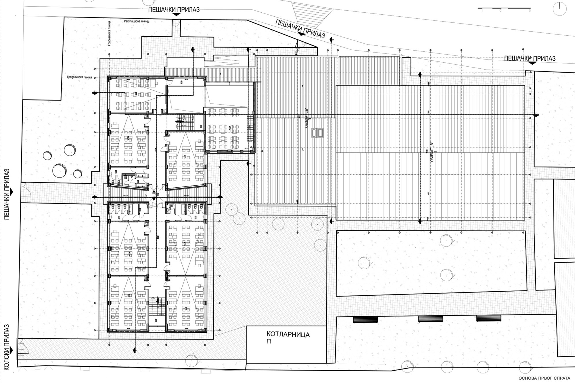 Postojeći objekti svlačionica i fiskulturne sale su zadržani i rekonstruisani. Sastoje se samo od prizemlja u kojem se nalaze svlačionice za đake, kabinet nastavnika fizičkog vaspitanja, pomoćne prostorije, ostave za opremu i sama fiskulturna sala.