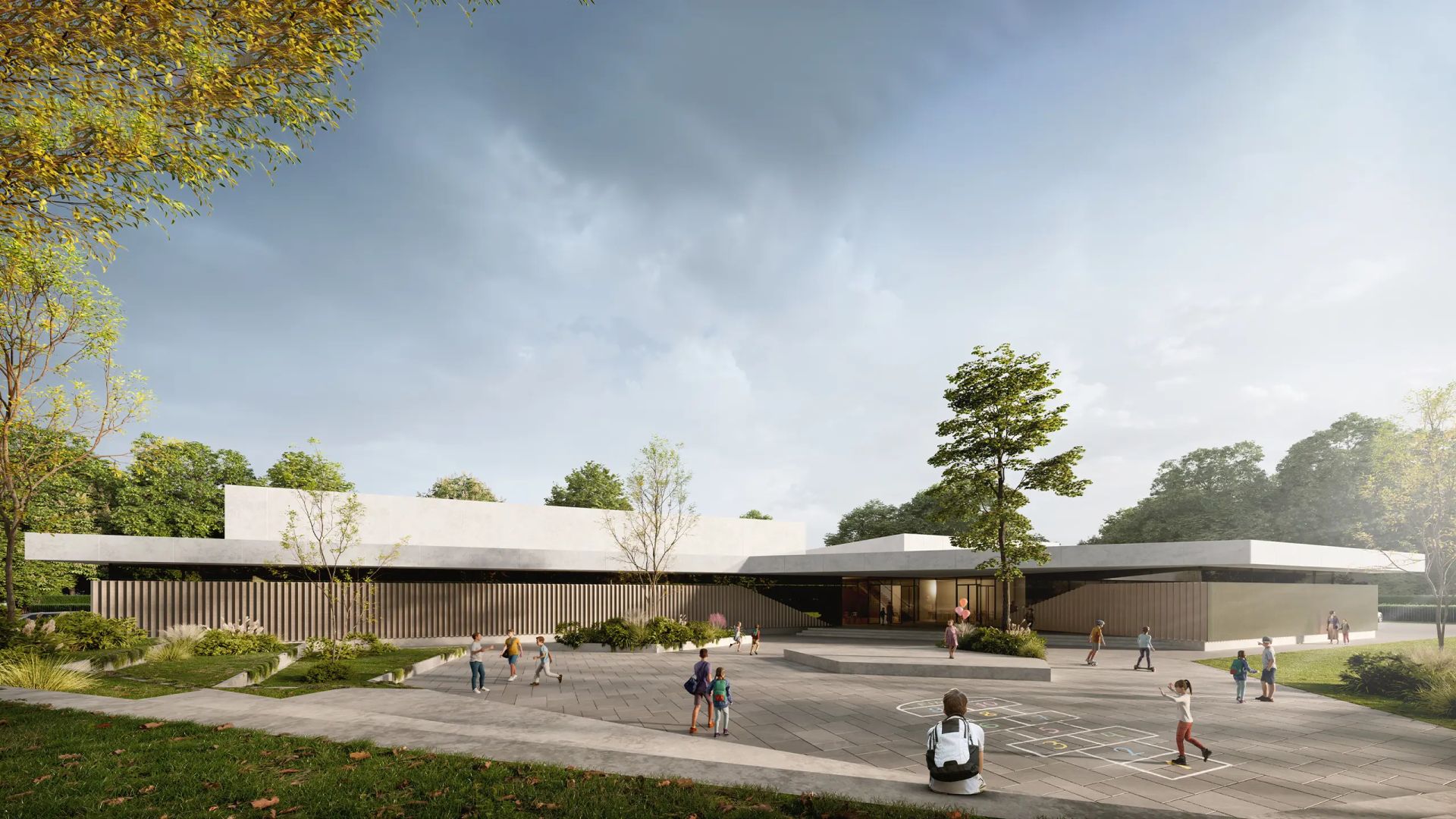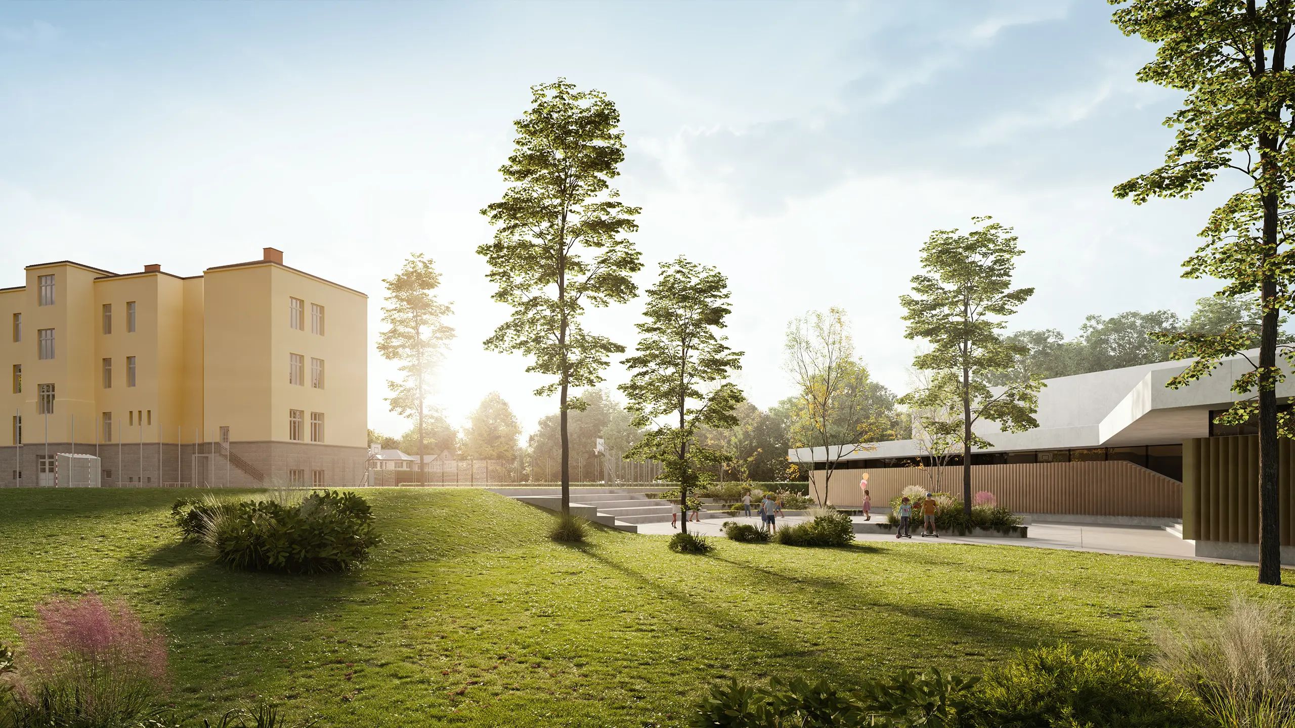 Nova fiskulturna sala, delimično ukopana u zemlju, postaje deo pejzaža, dok njen krov pruža dodatni teren za aktivnosti na otvorenom.