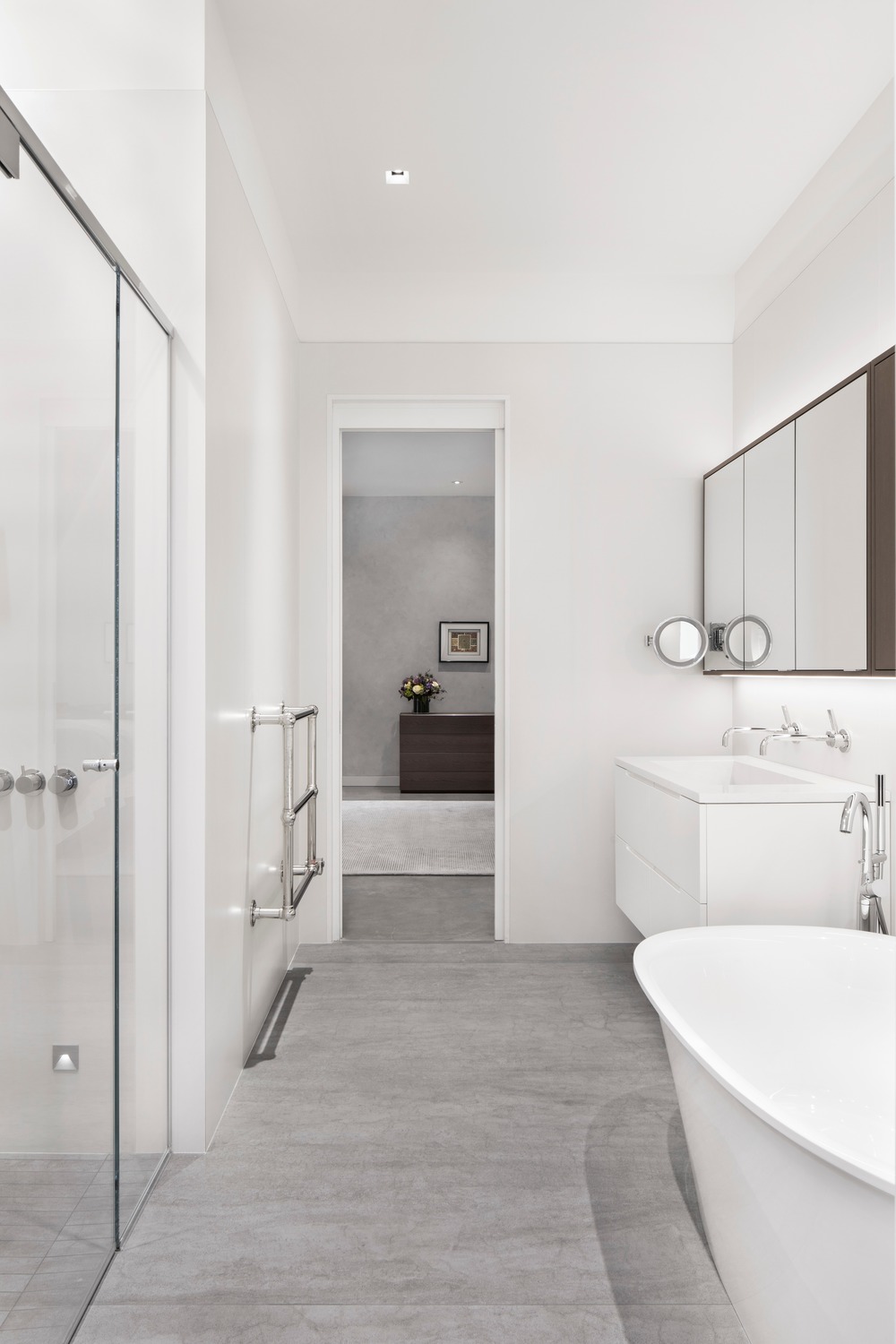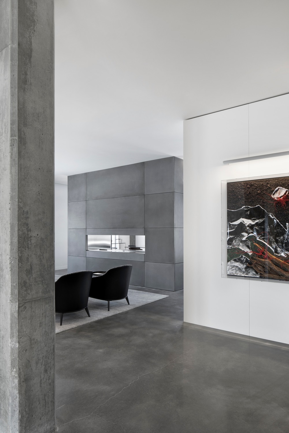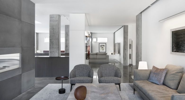 Jedini element koji su dizajneri ostavili netaknutim jeste betonski pod koji od ranije imao ugrađeno grejanje pa nije bilo smisla menjati ga. Kuhinjski elementi urađeni su u beloj i u boji hrasta, koja celom prostoru pruža dašak topline. Slične nijanse prisutne su i u dnevnom boravku, ali se tamo nalaze na tkaninama.