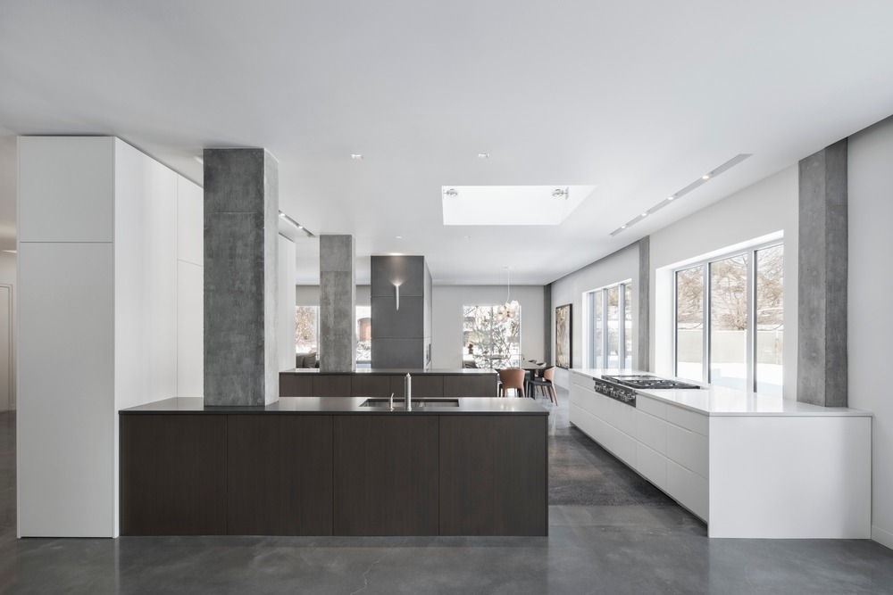 Potpuno otvaranje kuhinje bilo je moguće jer je kuća izgrađena skeletno pa tako nema nosećih zidova već je isključivo nose betonski stubovi. Spuštanje elemenata za skladištenje na pod doprinelo je tome da do kuhinje dopire još više prirodnog svetla.