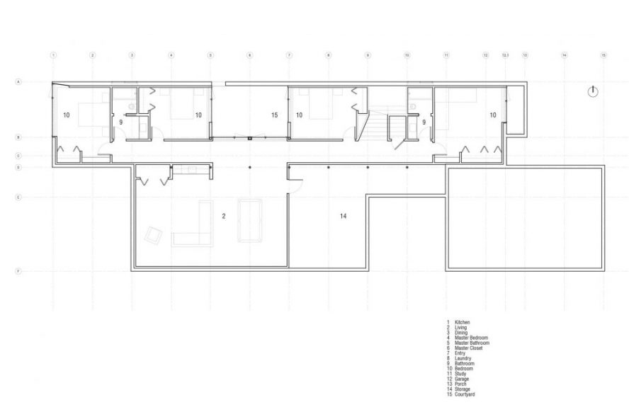 Na gornjem nivou kuće, preko kog se i ulazi u sam objekat, smeštene su spavaće sobe, dok se između njih nalazi kuhinja i dnevni boravak s trpezarijom.