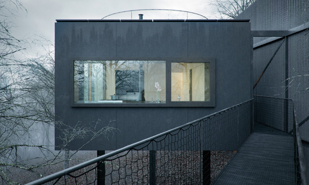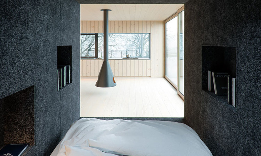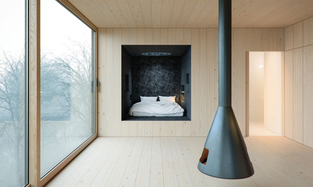 U kući postoji kuhinja, kupatilo, spavaća soba u niši i dnevni boravak dok je terasa smeštena na krovu. Jedini element u dnevnom boravku je centralno postavljeni viseći kamin kako bi se sav akcenat stavio na pogled ka šumi i nemirnom jezeru.