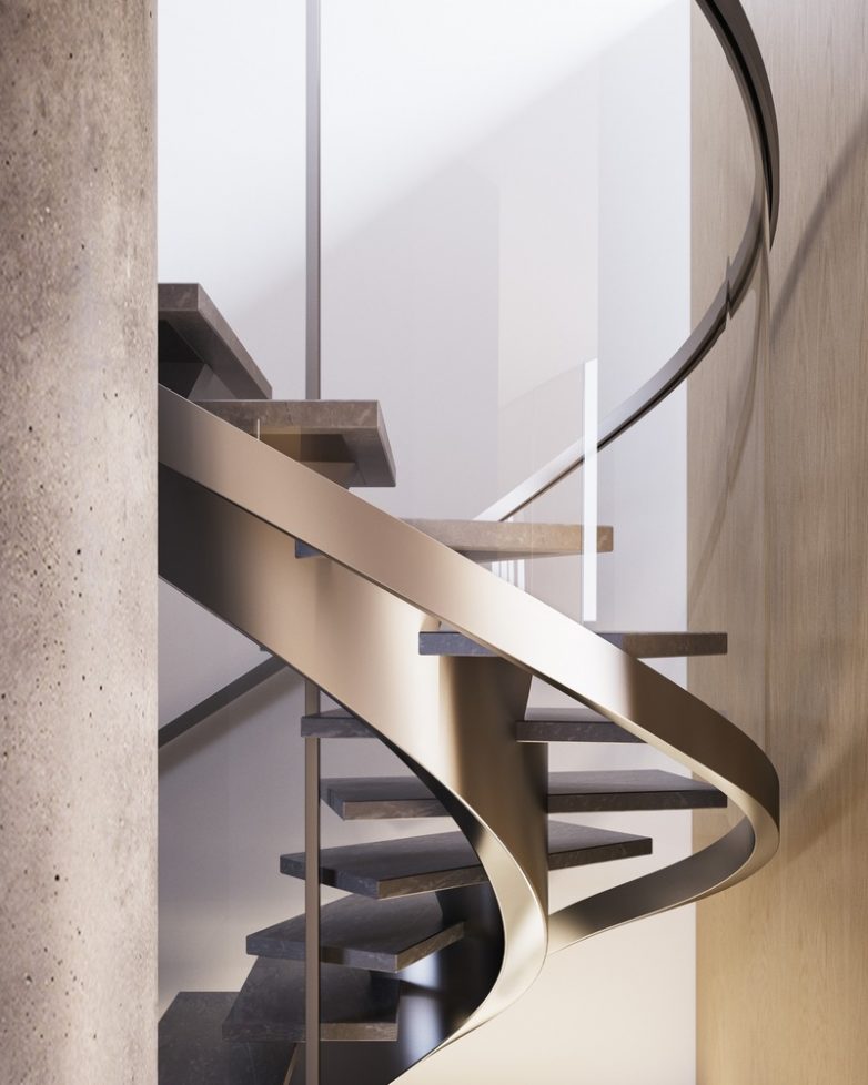 Spiralno stepenište, rađeno po narudžbini, izvedeno je od italijanskog kamena Pietra Cardosa, stakla i nerđajućeg čelika satenske završnice.