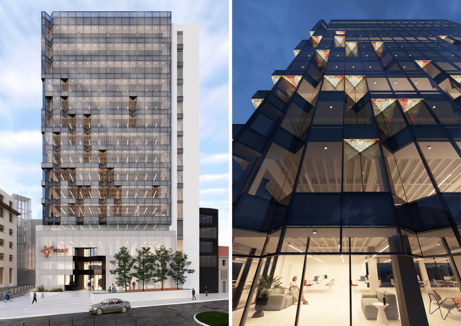 Glavna membrana objekta je fasada od staklene zidne zavese koja podseća na ritam i raspored otvora koje je nekada imala prethodna zgrada. Vertikalnost fasade zgrade je u kontri sa snažnim horizontalama koje se pomeraju u poređenju s postojećim dimenzijama osnove i na taj način čine da prednja strana zgrade dobije potrebnu dinamiku.