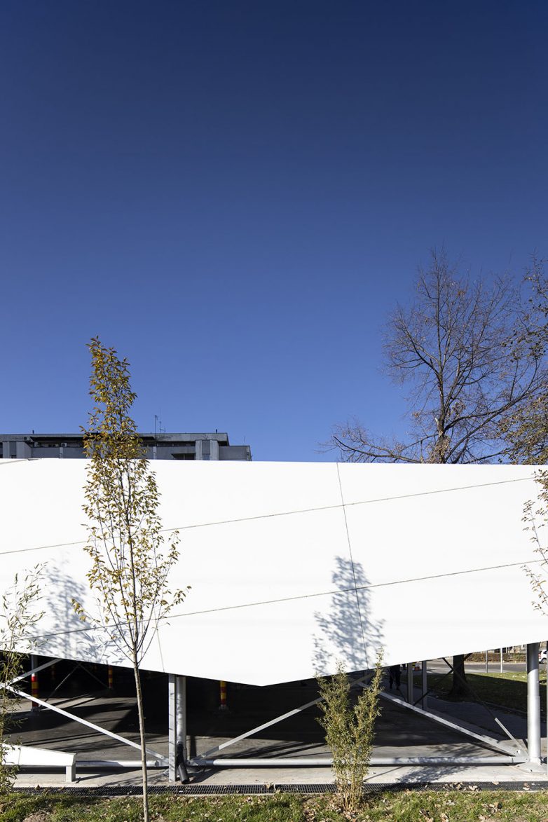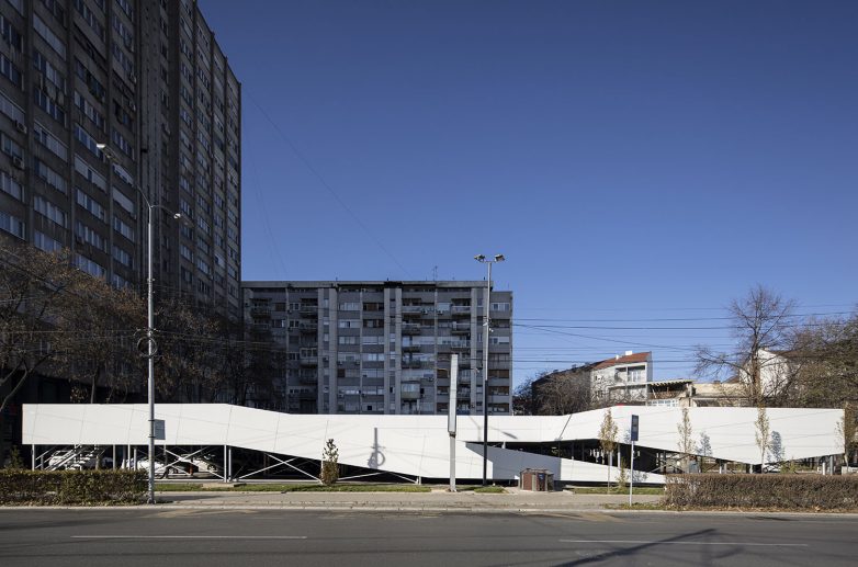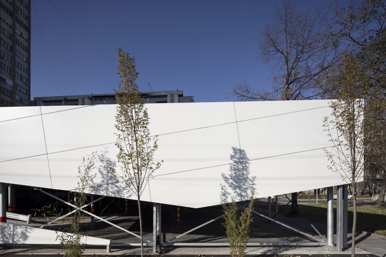 Konstrukcija ovog fast-parka osmišljena je tako da se kontrastom materijala postigne da linearni omotač naizgled levitira nad tlom.