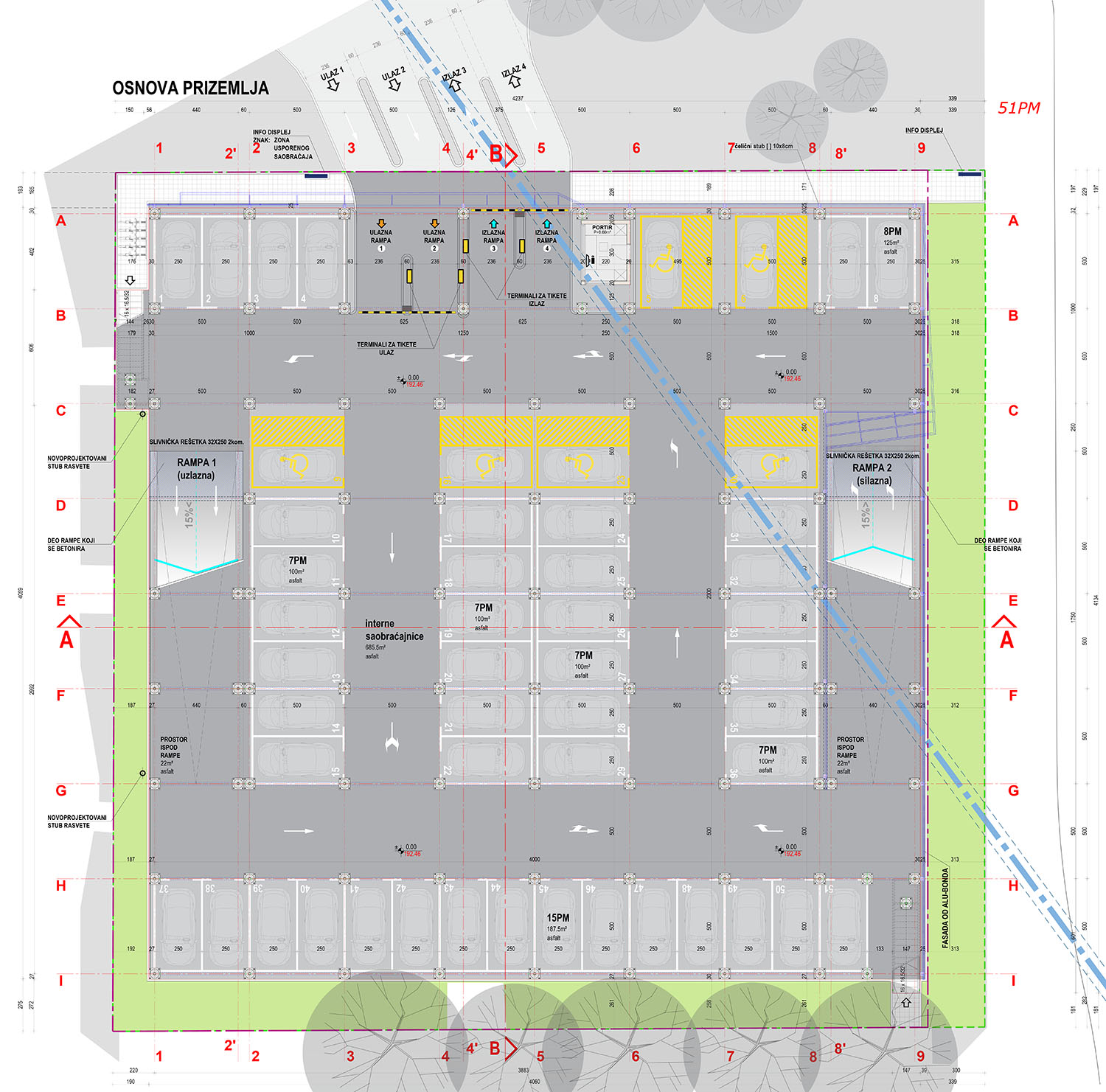 Na prvoj etaži se nalazi 51 parking mesto. Od tog broja, 45 parking mesta je standardnih dimenzija i 6 parking mesta za osobe sa ograničenom sposobnošću kretanja.