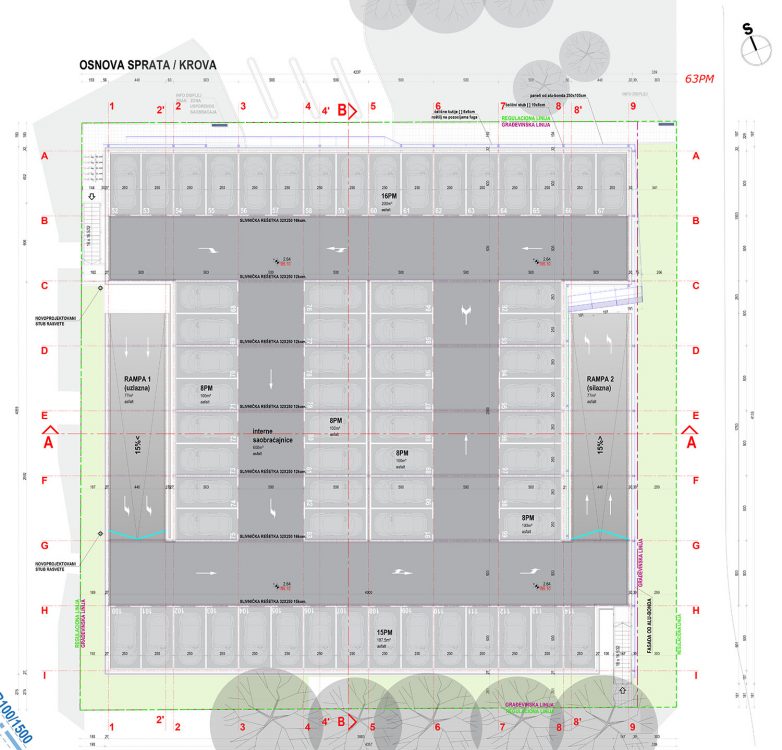 Do druge etaže dolazi se dvema rampama za jednosmerno kretanje vozila, maksimalne širine 5,0 m i nagiba 15%. Na gornjoj etaži omogućeno je parkiranje 63 vozila, na parking mestima standardnih dimenzija. Do druge etaže vode i dva jednokraka stepeništa.