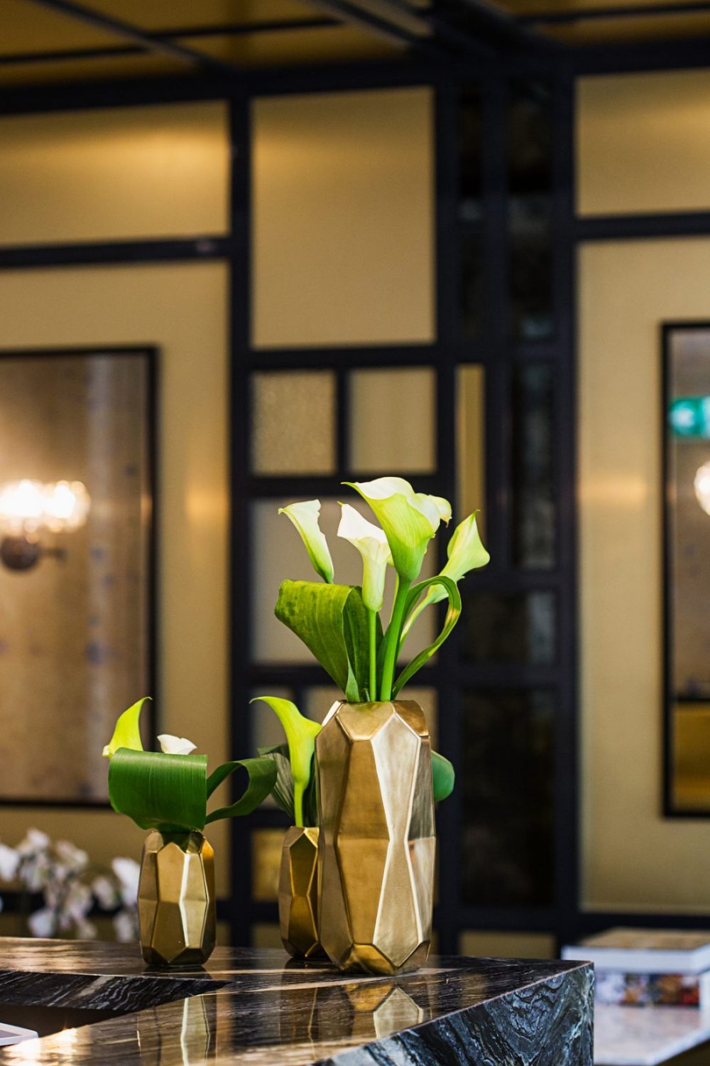 Prilikom oblikovanja enterijera korišćena je bogata paletu materijala, uključujući mesing, tamni kamen, tkanine u smaragdno-zelenim tonovima, kao i staklo peskarenog izgleda.