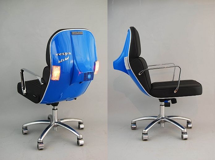 Španski dizajnerski studio Bel & Bel napravio je kancelarijske stolice od delova nekada veoma popularnih Vespi. Stolice su obložene kožom i imaju originalni prednji oklop, kao i prepoznatljiv far ovog motora.