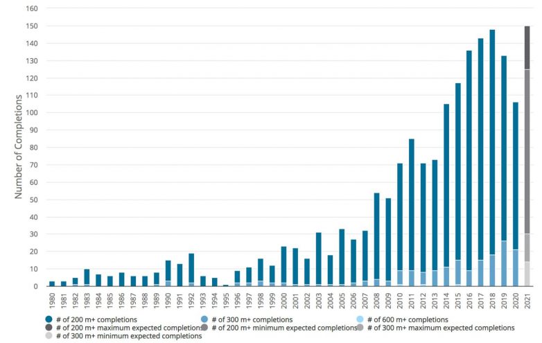 Ipak, navodi se da je protekla godine druga po redu u kojoj se beleži pad broja izgrađenih nebodera visine preko 200 metara, te se može pretpostaviti da pandemija korona virusa nije jedini uzrok.