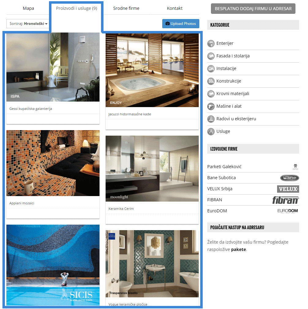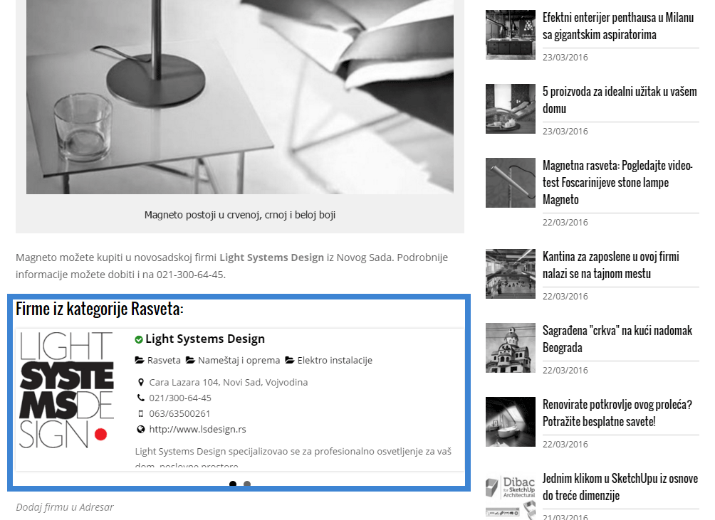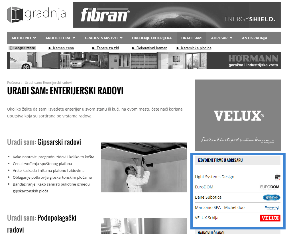 - Pojavljivanje profila firme u srodnim tekstovima na portalu Gradnja.rs,