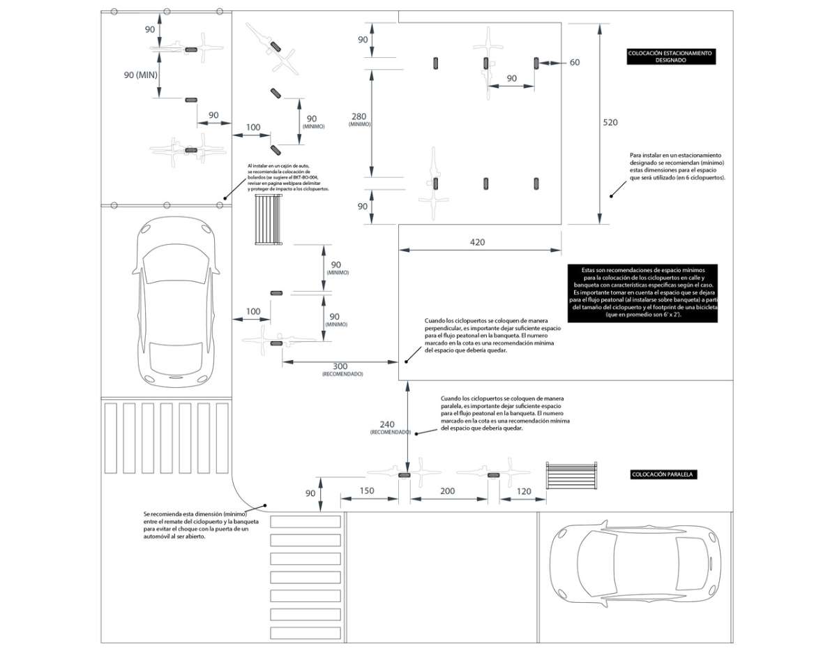Potrebno je obezbediti dovoljno mesta za prolaz bicikla i njegovog vozača oko parkinga. Potrebno je obratiti pažnju da minimalna udaljenost od zida, drveta ili nekog drugog elementa u prostoru bude 50cm.