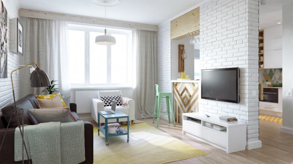 Stanom dominiraju razdragane pastelne boje koje čine enterijer veselim i pozitivnim. Iskorišćena je i cigla na zidovima koja je samo prekrečena u belu boju.