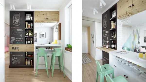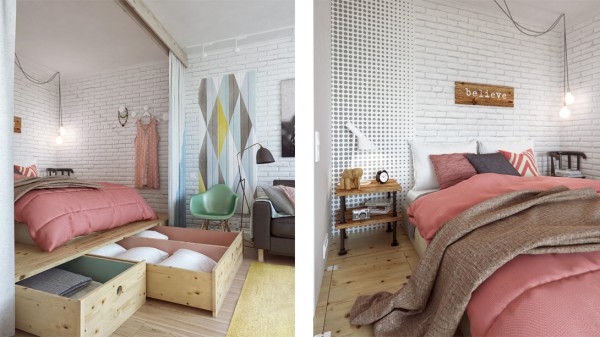 Arhitektonski biro Int2 architecture uradio je enterijer jednosobnog stana od 45 kvadratnih metara. Open-space rešenje enterijera omogućio je da stan deluje prostrano ali su morala biti primenjena neka interesantna rešenja. Spavaća soba, koja je deo dnevne sobe, odvojena je zavesom i izdignuta na drveno postolje kako bi se vizuelno ragraničila od ostatka prostorije. Drveno postolje poslužilo je i kao prostor za skladištenje koje je uvek problematično u malim stanovima.