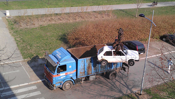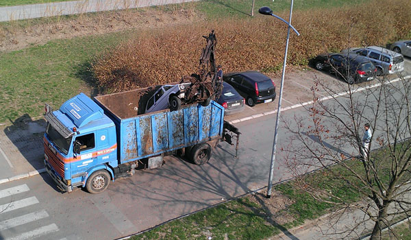 Ne nije u pitanju greška parking servisa već se radi o službi za odnošenje krupnog otpada koji stare automobile odnosi sa lica mesta, melje ga, reciklira i za sve to vam daje novac u odnosu na njegovu težinu.