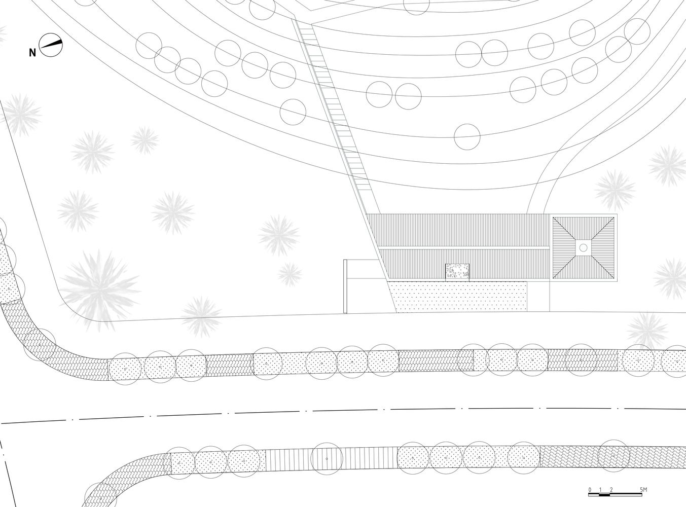 Prilikom kreiranja nove topografije, bunar sa paviljonom pozicioniran je na istočnoj strani kampusa i u padini uzvišenja visine oko 10 metara, što je dovelo do jake veze između paviljona i brda. Dva zida paviljona kao da ograničavaju brdo, a istovremeno je ovaj prostor usmeren na njega.