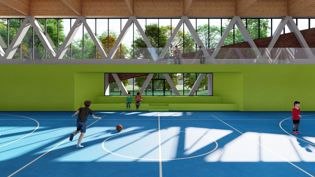U zoni sportskih terena planirana je izgradnja dvostrano orijentisanih sportskih tribina, koje su predviđene sa toaletima i svlačionicama u suterenskom podtribinskom delu.