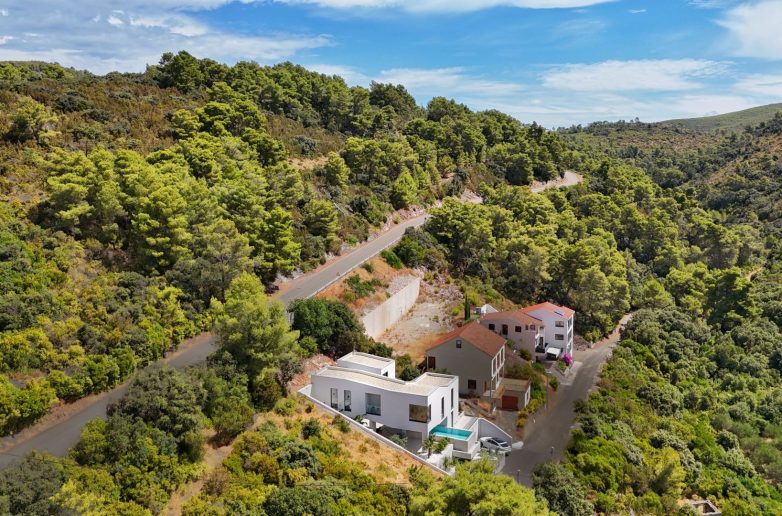 S ukupno 250 m² zatvorenog prostora i 120 m² terasa, vila je koncipirana kao beli betonski volumen s izraženim horizontalama, velikim konzolnim natkrivenjima i kontrolisanim otvorima koji omogućuju optimalno osvetljenje i ventilaciju.