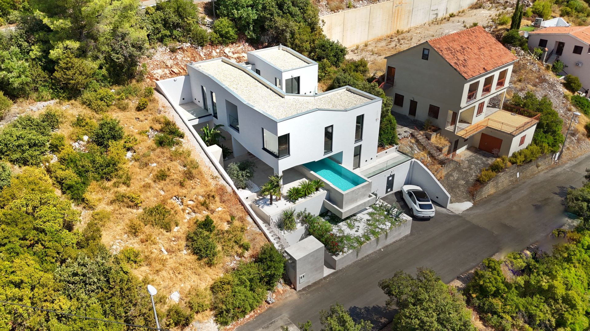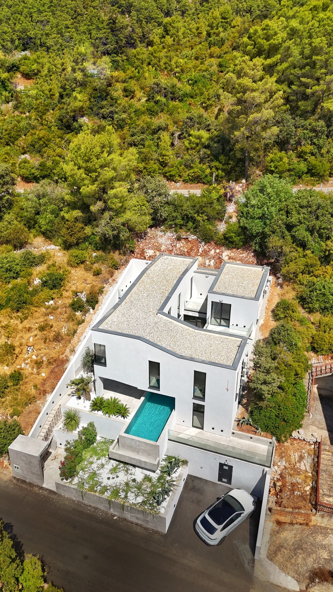 S ukupno 250 m² zatvorenog prostora i 120 m² terasa, vila je koncipirana kao beli betonski volumen s izraženim horizontalama, velikim konzolnim natkrivenjima i kontrolisanim otvorima koji omogućuju optimalno osvetljenje i ventilaciju.