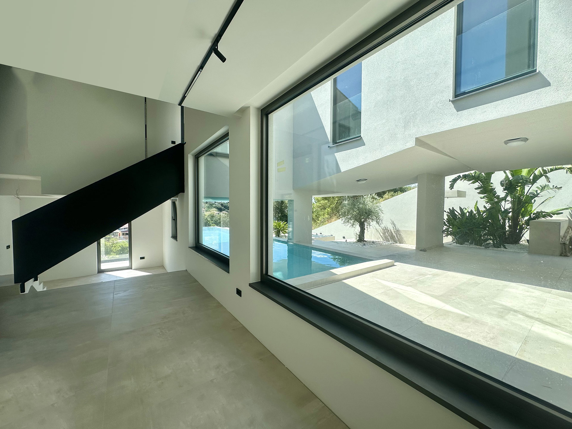 Korišćena je prvoklasna italijanska keramika velikog formata (75 × 150 cm), ujednačena kroz sve prostore – unutrašnje, spoljašnje i u samom bazenu – čime se postiže nenametljiv osećaj prostorne kohezije. Površine se ne prekidaju na pragovima ili prelazima, već se povezuju u tekuću prostornu matricu.