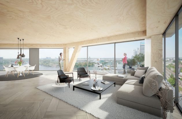 Zgrada HAUT sa svojom visonom od 73 metra biće najviša drvena zgrada u Holandiji. Drvena konstrukcija oko betonskog jezgra činiće zgradu od 22 sprata sa raznovrsnom ponudom stanova.  Kupci će moći da biraju između stanova na jednom nivou ili duplekse različitih kvadratura, piše ArchDaily.