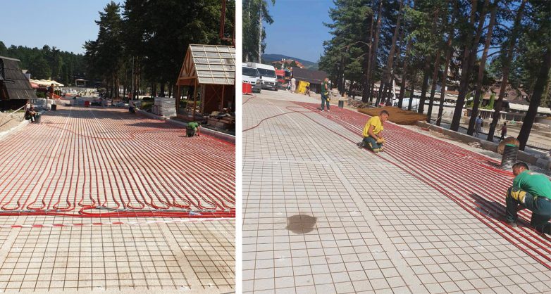 Polaganje cevi podnog grejanja na prilaznom putu i trgu na Zlatiboru. Foto: Rehau