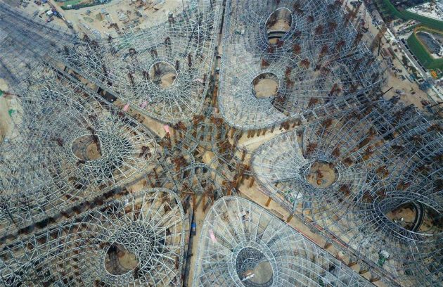 Kao što se može videti na slikama, u pitanju je gradilište velikih razmera sa impresivnom čeličnom konstrukcijom koja kreće od jezgra a završava se na kracima dugačkim po 600 metara. Kako piše kineska agencija, svaki krak biće urađena tako da predstavlja tradicionalne kineske motive poput svile, čaja, porcelana…