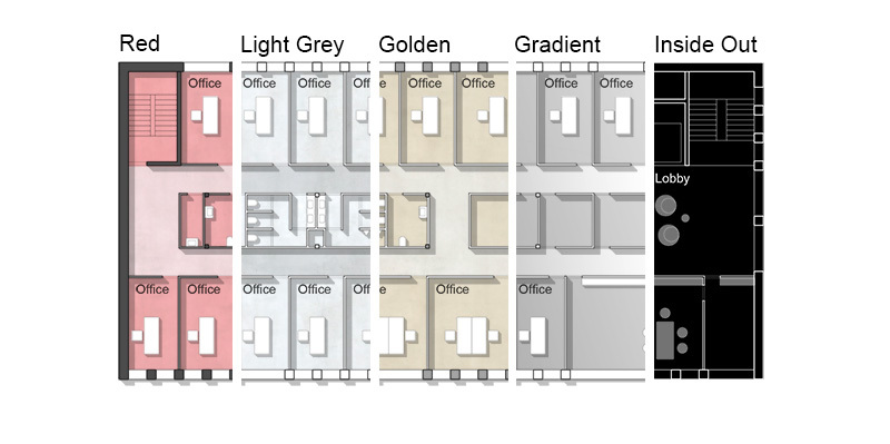 Kako biste stvorili suptilan i apstraktan prikaz osnove možete koristiti concrete pattern i postaviti ga na vaš lejer. Ako želite da vršite izbor u širokom rasponu tekstura pretragu obavite na na cgtextures.com i tamo ćete dobiti sve što vam je potrebno. Za crveni izgled prikaza možete koristiti color overlay i u opciji blend mode izaverite „multiply“ za intezitet postavite za kancelarije 30%, hodnike 10% ukoliko želite isti prikaz kao na uzorku. Ukoliko želite ovakav izgled, vaše boje i lejere postavite na ovaj način: