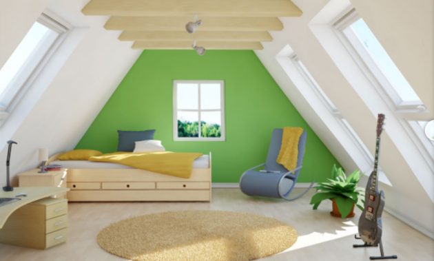 U ovom primeru renoviranja, deo krovne konstrukcije ostao je vidan, upotrebljena je jaka boja na zabatnom zidu koja dominira prostorom i postavljeno je šest krovnih prozora koji ispunjavaju ovu dečiju sobu svetlošću i svežim vazduhom.