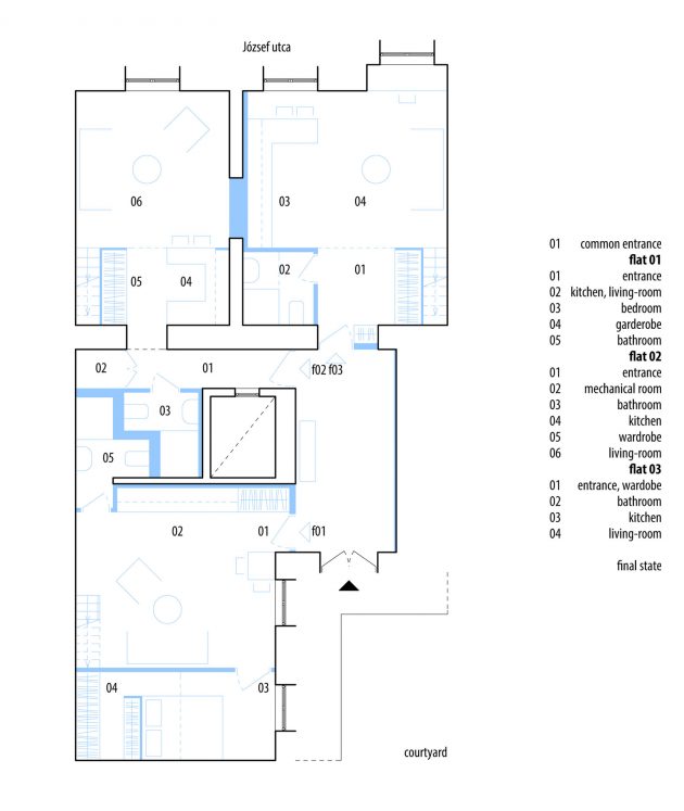 Prilično velik stan pretvoren je u tri manja tako što je za početak formiran hodnik u obliku slova L koji omogućava da se svakom stanu priđe zasebno. Mokri čvorovi odredili su položaj budućih kupatila i kuhinja u novostvorenim stanovima, a potom je oko njih organizovan dnevni borakavak sa trpezarijom i radnim kutkom, piše ArchDaily.
