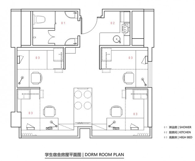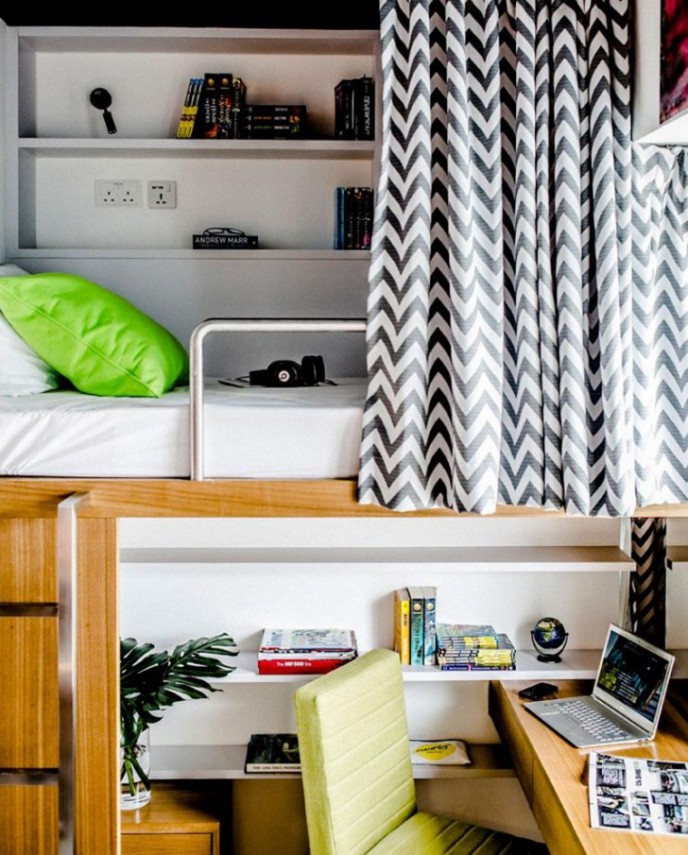 Kao i u svakom studentskom smeštaju i ovde je svaki deo prostora maksimalno iskorišćen. Ispod izdignutih kreveta, kojima se pristupa pomoću merdevina, postavljani su radni stolovi.