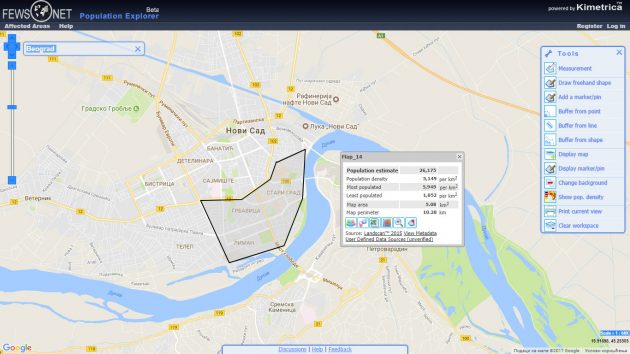 Dobra stvar je da Population Explorer radi i u Srbiji. Doduše, napredni podaci o odnosu žena i muškaraca kao i o starosti populacije ne postoje ali zato možete, na primer, crtanjem po mapi ograničiti deo grada i dobićete analizu koju čak možete da izvezete i u Excel.