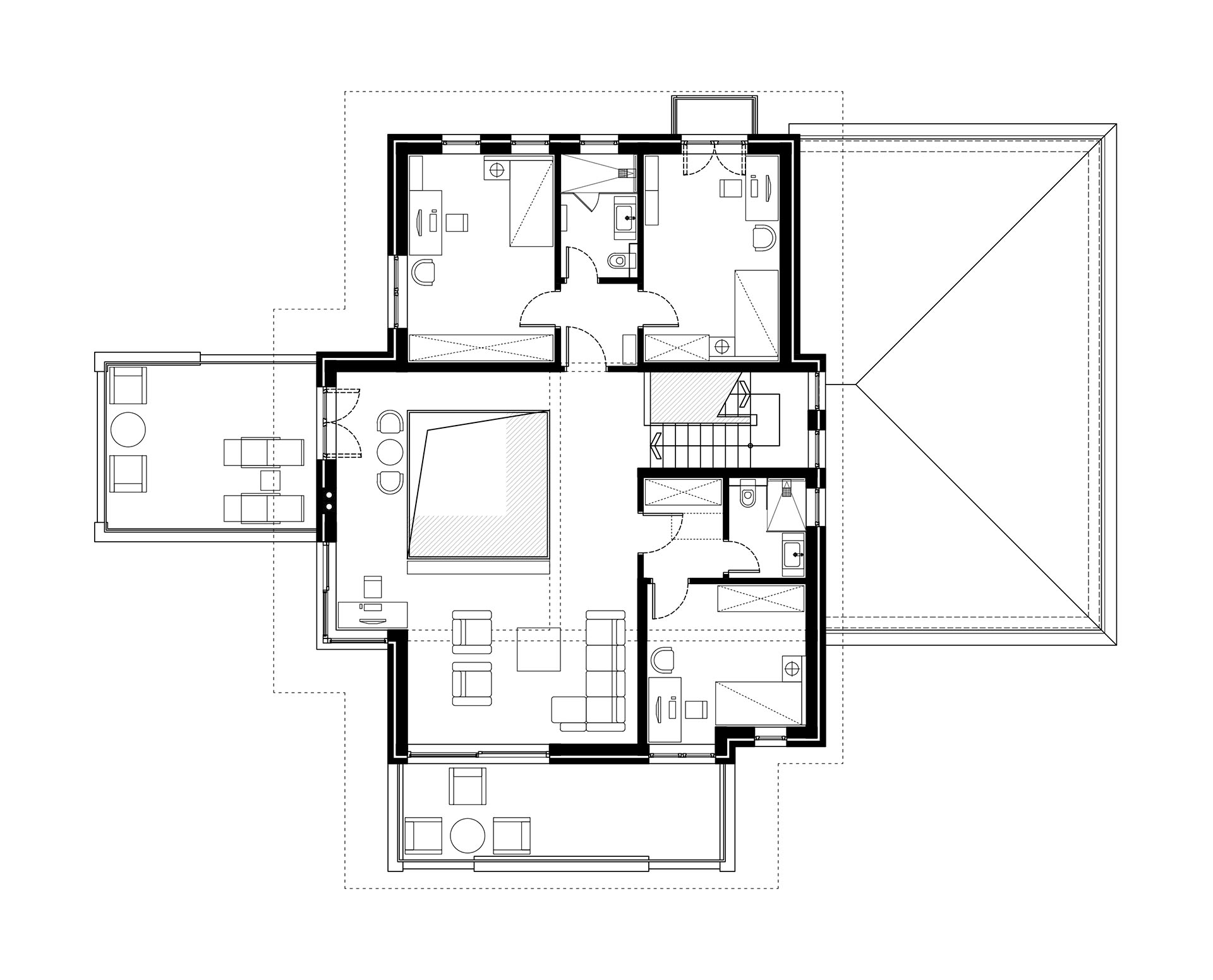 Njihovim pozicioniranjem je proširen dnevni boravak i omogućen neposredan kontakt zajedničkih sadržaja sa okruženjem i širokim vizurama.
