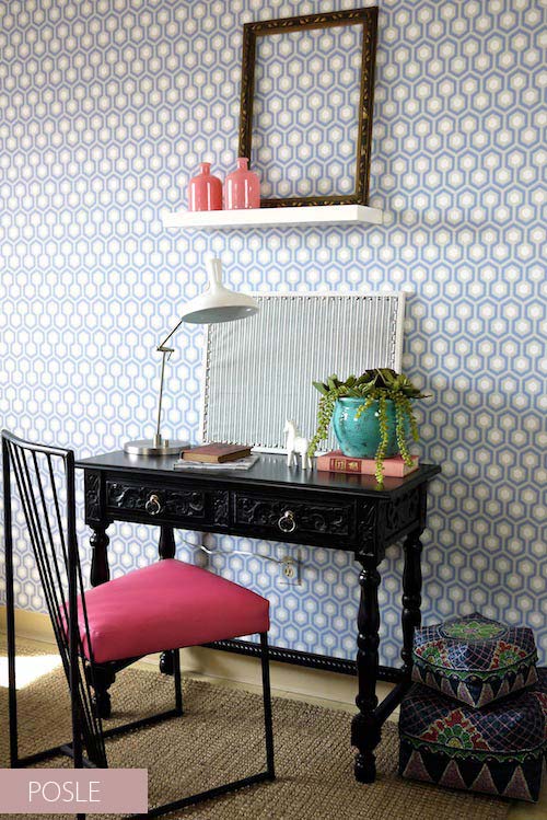 Krevet je najveći komad nameštaja u sobi ali on nije njen glavni fokus. Kako ova soba funkcioniše i kao dnevna soba, krevet je povučen uz prozor i tokom dana on deluje kao sofa za sedenje. Tu su dve stolice i dva taburea. Upečatljiva je tapeta sa geometrijskim motivom na zidu ali i tkanine jastuka i drapera. Radni sto je dorađen i prefarban.