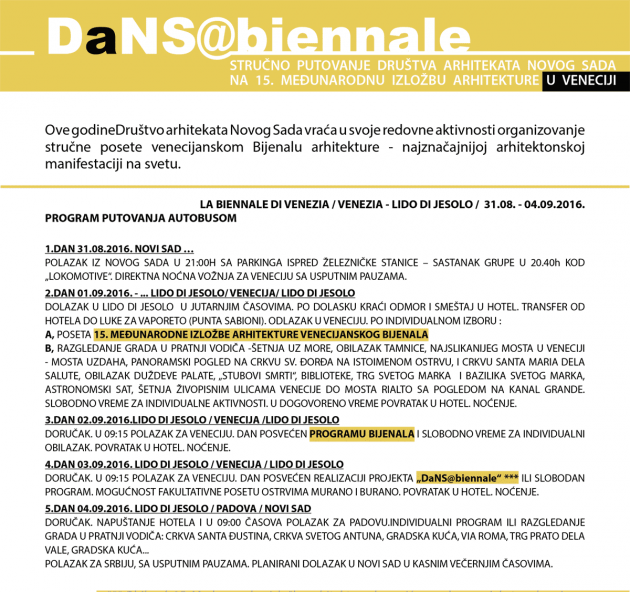 DaNS organizuje posetu 15. Međunarodnoj izložbi arhitekture u Veneciji u periodu od 31. avgusta do 4. septembra.