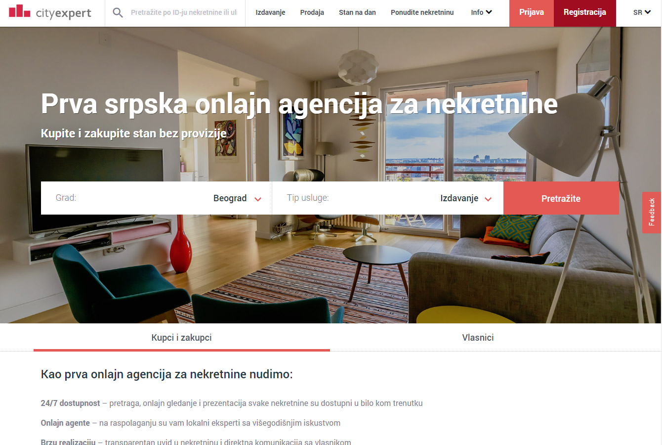 Jedan od lidera na tržištu svakako je City Expert, prva domaća onlajn agencija za nekretnine koja je iz korena promenila način pretrage nekretnina u Beogradu i Novom Sadu. Prednosti City Experta su brojne. Pre svega, za svaku nekretninu (bilo da se izdaje ili prodaje) postoji galerija slika, video snimak ili 360 virtuelna tura. Potencijalni korisnik se može informisati o nekoj nekretnini bez direktne posete ili posredovanja agenta. Pored toga, na raspolaganju su mu i brojne druge korisne informacije. Pretraživanje stanova za dnevno iznajmljivanje (Stan na dan) naročito je popularna alatka.