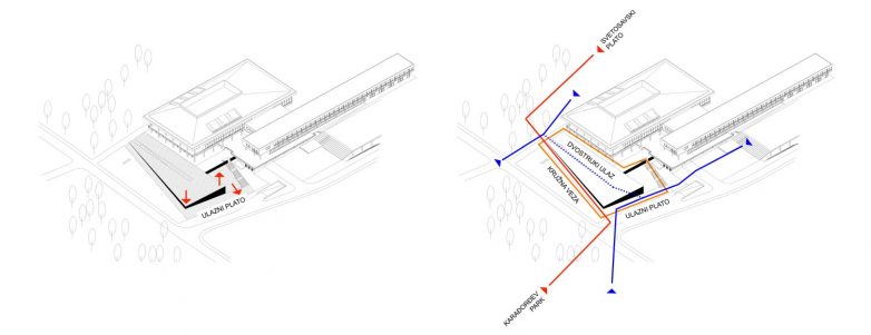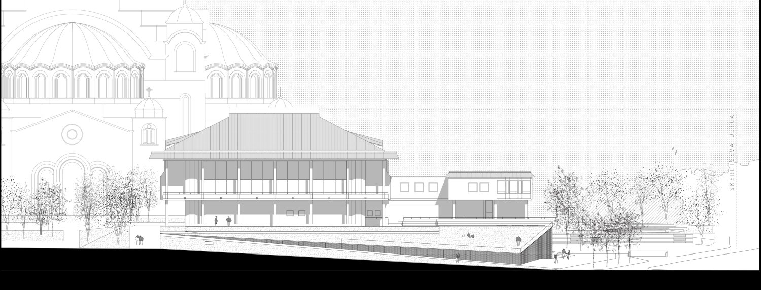 Koncept predloženog rešenja je formiranje prostorno determinisanog javnog prostora ispred postojećeg objekta Narodne biblioteke Srbije. Denivelisanjem postojećeg terena formira se novi ambijent – pristupni plato sa glavnim ulazom u multifunkcionalnu salu i uspostavlja se veza između prostora ispred Hrama Svetog Save i Skerlićeve ulice.